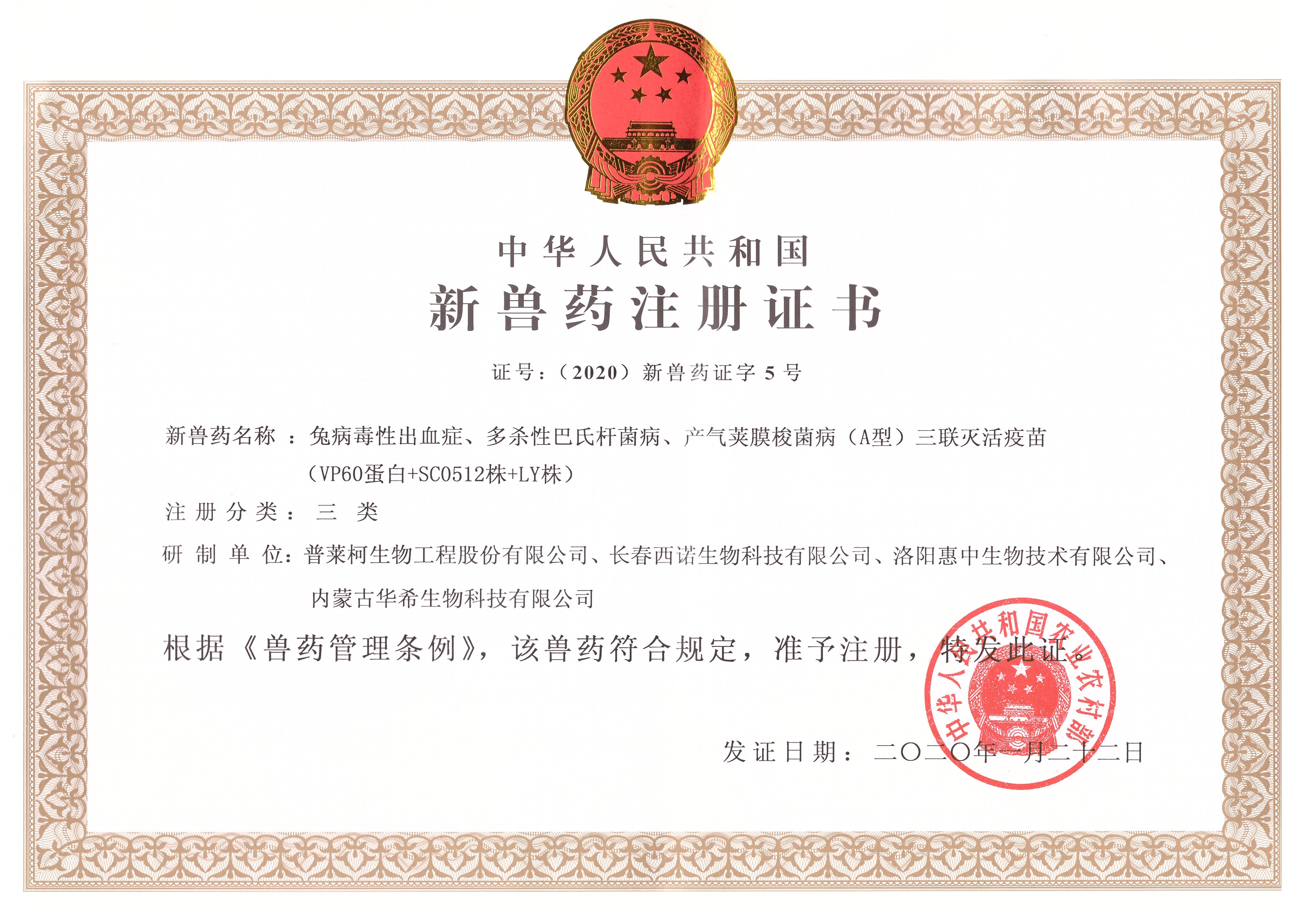 2020年3月,我公司获得“兔病毒性出血症、多杀性巴氏杆菌病、产气荚膜梭菌病(A型)三联灭活疫苗”