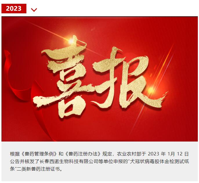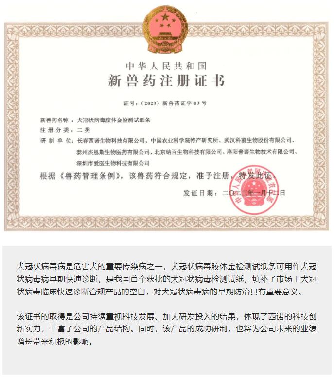西诺生物喜获“犬冠状病毒胶体金检测试纸条”新兽药注册证书